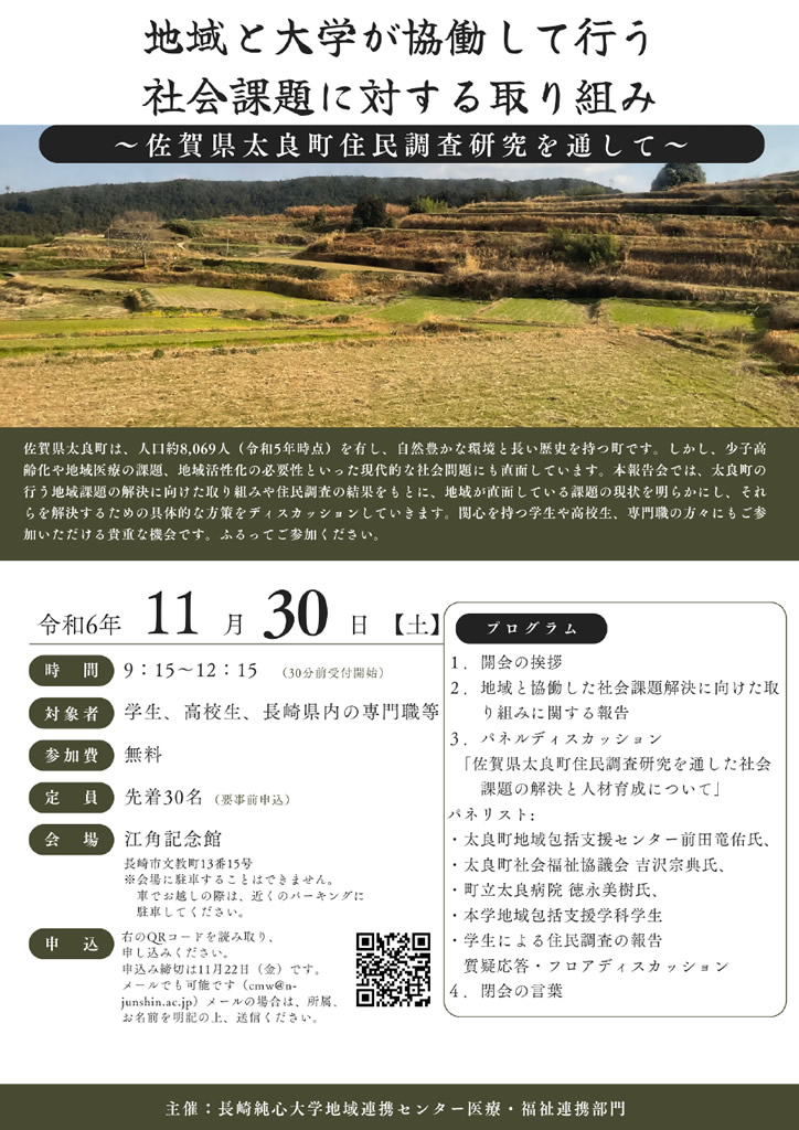 このたび、長崎純心大学地域連携センターでは、「地域と大学が協働して行う社会課題への取り組み」をテーマにした報告会を開催いたします。本報告会では、佐賀県太良町における住民調査研究を通して得られた成果や社会課題の解決に向けた取り組みについてご紹介いたします。また、パネルディスカッションを通じて、地域社会との協力による人材育成や実際の取り組みの成果について議論します。