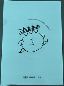 青は、長崎純心大学のスクールカラー。男性も本学にはたくさん在籍していますよ、というアピールで、表に男の子をデザイン。前髪は、大学の学章をモチーフにして手書き風のタッチを大切にしました。顔の周りの英字(大学名)の配置は、講師の江副氏に考えていただきました。