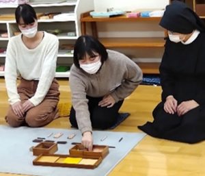 しかし、この4日間の間に、提供法の工夫やポイントにも気づく機会があり、モンテッソーリ教育の奥深さを感じることもできた。今後も、本番の試験や実習、卒業後に向けて練習を重ねていきたいと思う。(渕麗華) - この4日間で、これまで学んできた4領域を領域ごとに分けて行ったが、その中で自分はまだまだ子どもを意識して速さ、わかりやすさ、見やすさを考えて提供をすることができていなかったと感じた。また、自分の練習不足や、わかっていないところにも気づくことができた。これからの練習では、今回学んだことを意識して取り組んでいきたい。(木屋穂乃果)