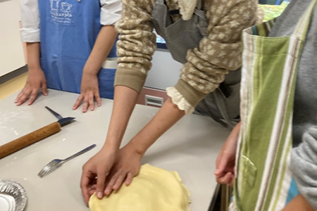 グループで協力。小麦粉とマーガリンをこねるのが大変。
