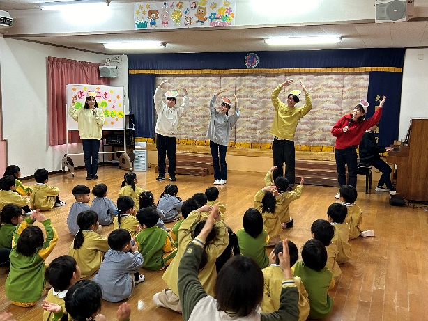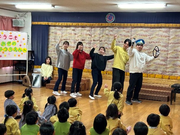 今回のキャラバン隊の活動は、大園幼稚園(長崎市)で行いました。テスト期間を挟みながらの練習だったため、完成度や進行に不安な点もありましたが、当日は、大園幼稚園の子ども達の反応が予想以上に大きく、笑顔や楽しそうに活動に参加してくれる姿にとても元気づけられ、今回の活動に取り組んで本当によかったと思いました。