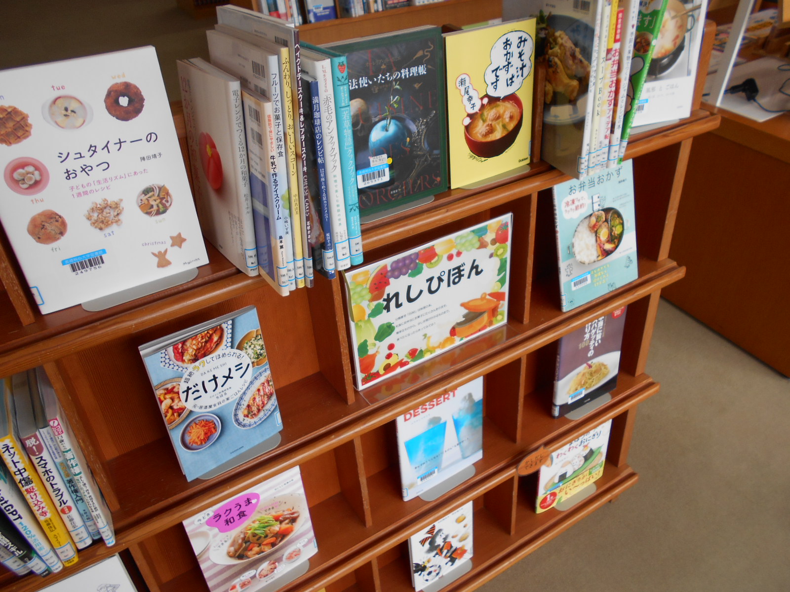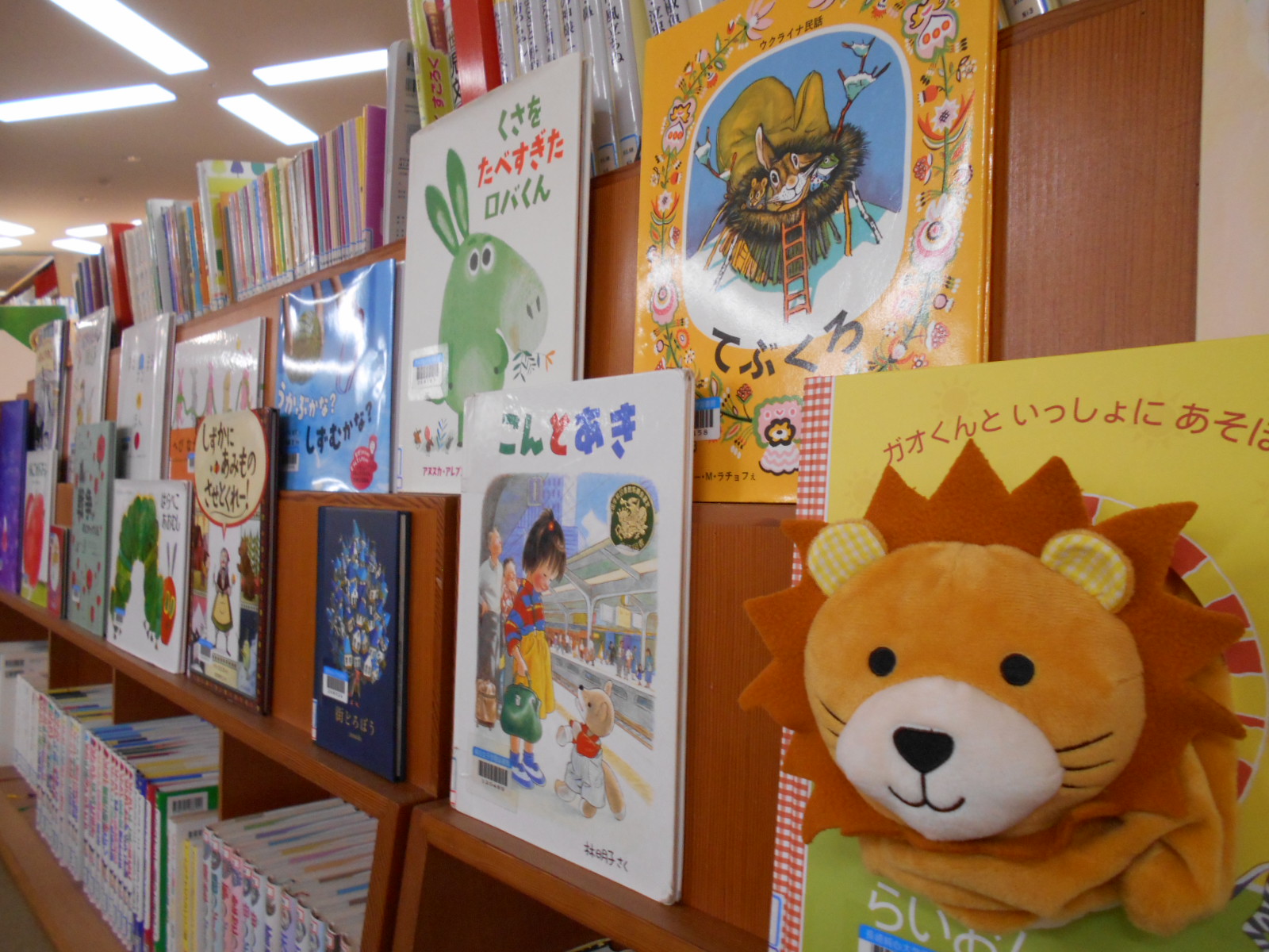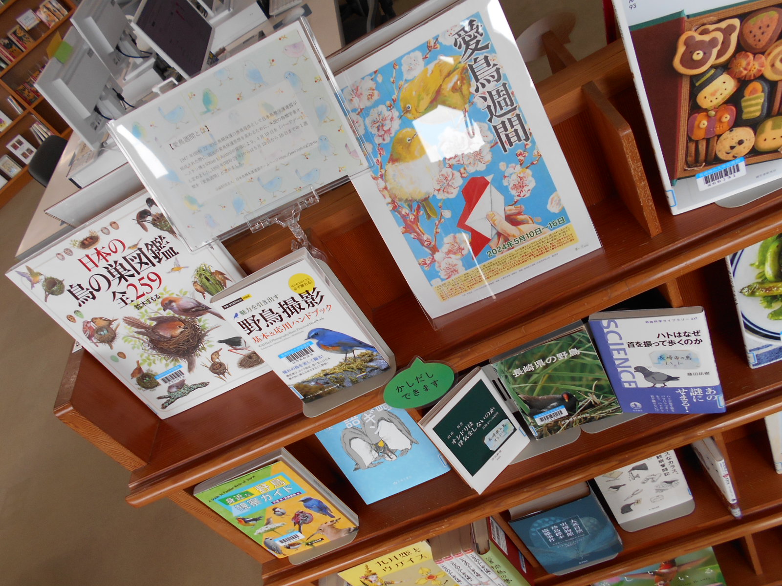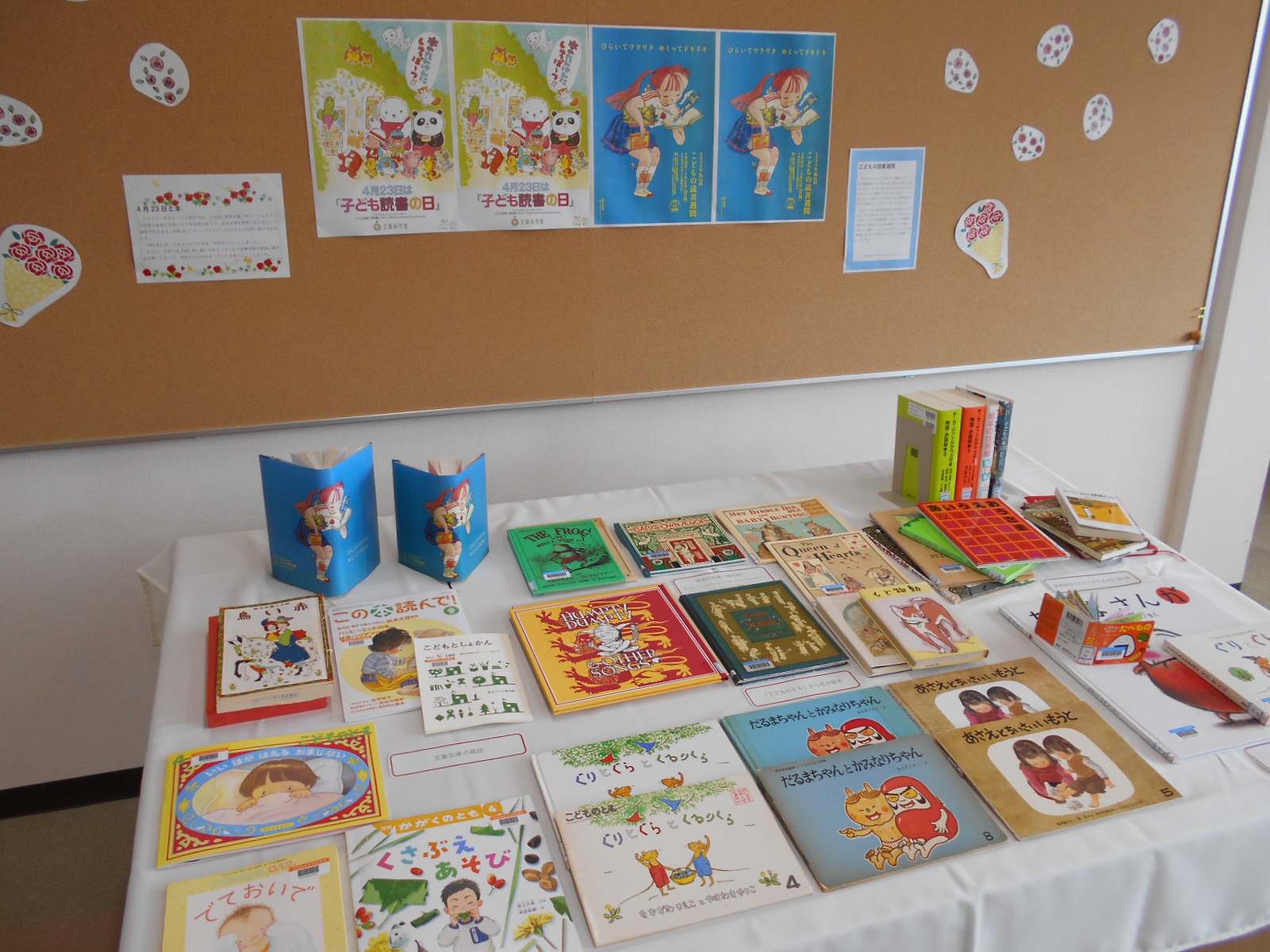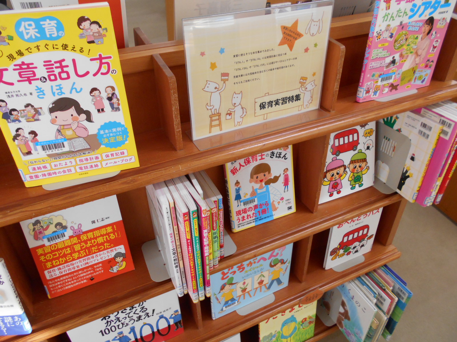 館内には展示用ブックトラックや児童文庫手前の本棚など、ほかにも本の展示スペースを設けています。
