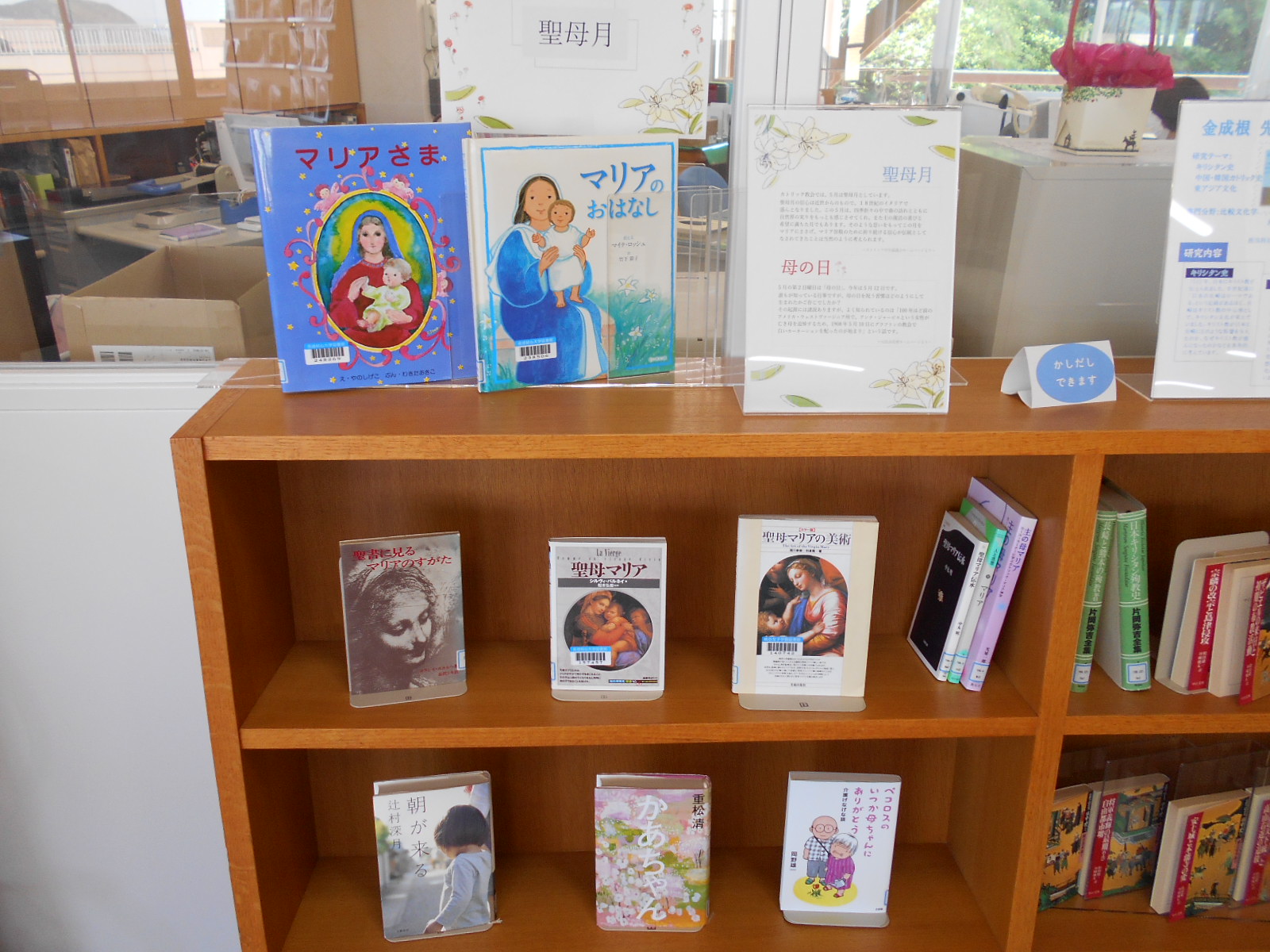 司書室のそばにある展示スペースです。こちらも気になる本棚と同様、時季にあう本を紹介しています。