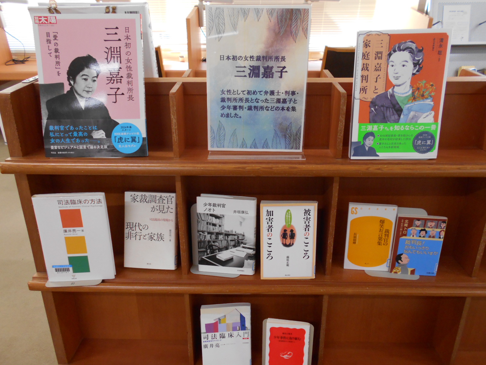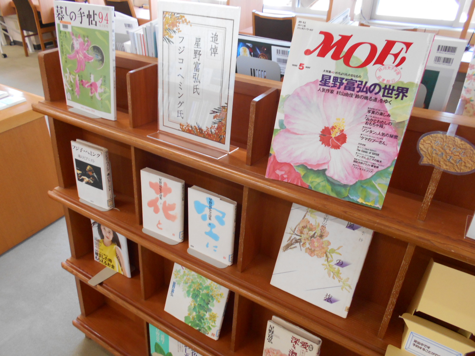 図書館カウンター前、季節・行事・最近の話題など、いま読みたい本を厳選して紹介しているスペースです。