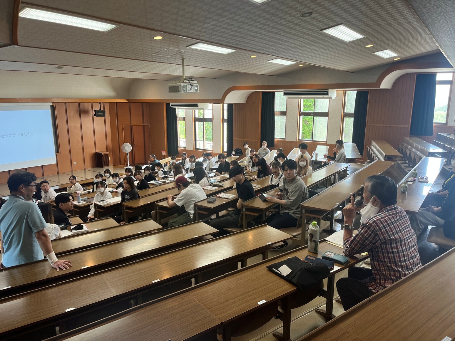 今年度は、3年に一度の「民生委員・児童委員」の改選の年にあたり、長崎県の福祉保健課地域福祉班から「民生委員・児童委員の認知度向上の取組」への協力依頼により、「民生委員・児童委員の役割と活動内容について」というテーマで「地域福祉と包括的支援体制I」の授業の中で講義が行われました。講義には、実際に民生委員として活動されている3名の方にも参加いただきました。