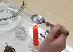 実験ではろうそくに火をともし、ろうが解けて液体となり流れる様子、スプーンにその液体を入れ、水に入れて固めて個体になる変化を見ます。