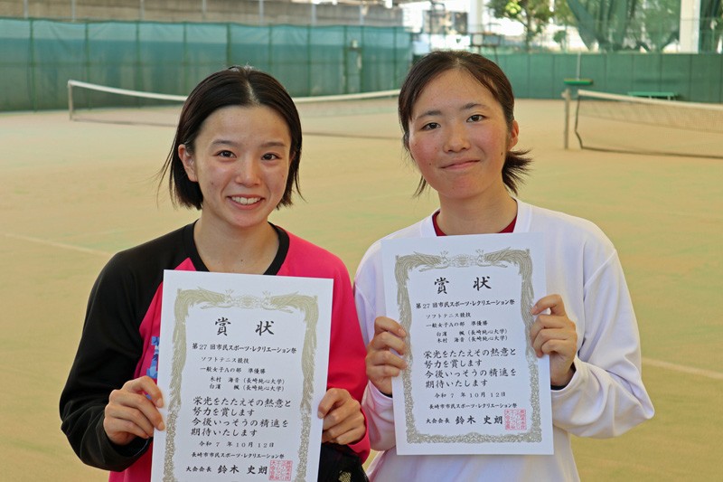 Homeお知らせ 2025.10.15クラブ・同好会 [ソフトテニス部]市民体育レクリエーション祭:一般女子Aの部「準優勝」(2025/10/12) 2025年10月12日(日)に平和公園市営庭球場(松山町)で「第27回市民体育レクリエーション祭(ソフトテニス)」が開催されました。 本学からは、「一般男子A」の部に5ペア、「一般男子B」の部に2ペア、「一般女子A」の部に2ペアが出場しました。上位入賞は、次の通りです。 一般女子Aの部 準優勝 木村 海音(文化コミュニケーション学科4年)・白濱 楓(文化コミュニケーション学科3年)ペア 学生会・クラブ・同好会 シェアツイート送る 次の記事へ 一覧へ戻る 前の記事へ