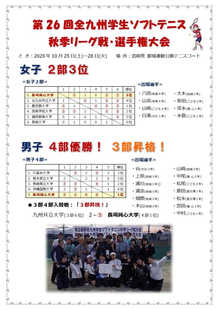2025年10月25日(土)~28日(火)に都城総合公園テニスコート(宮崎県都城市)にて、「第26回全九州学生ソフトテニス秋季リーグ戦・選手権大会」が開催されました。