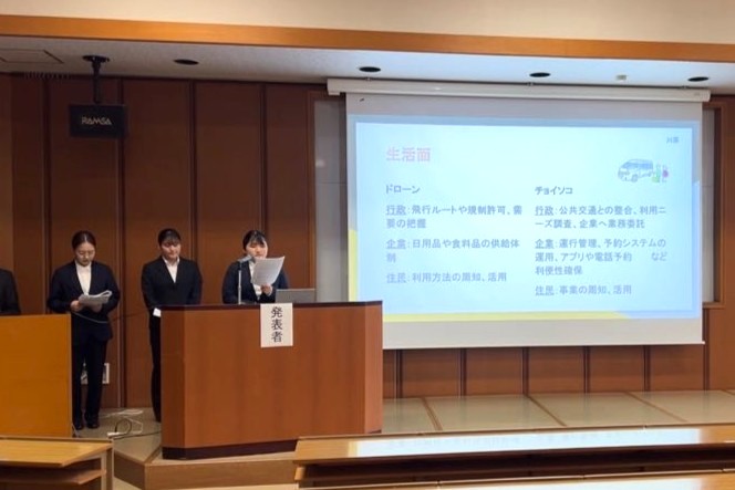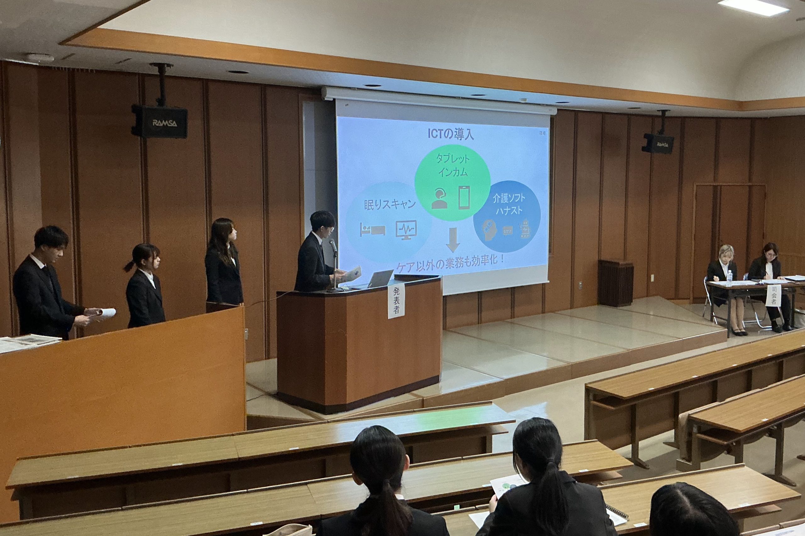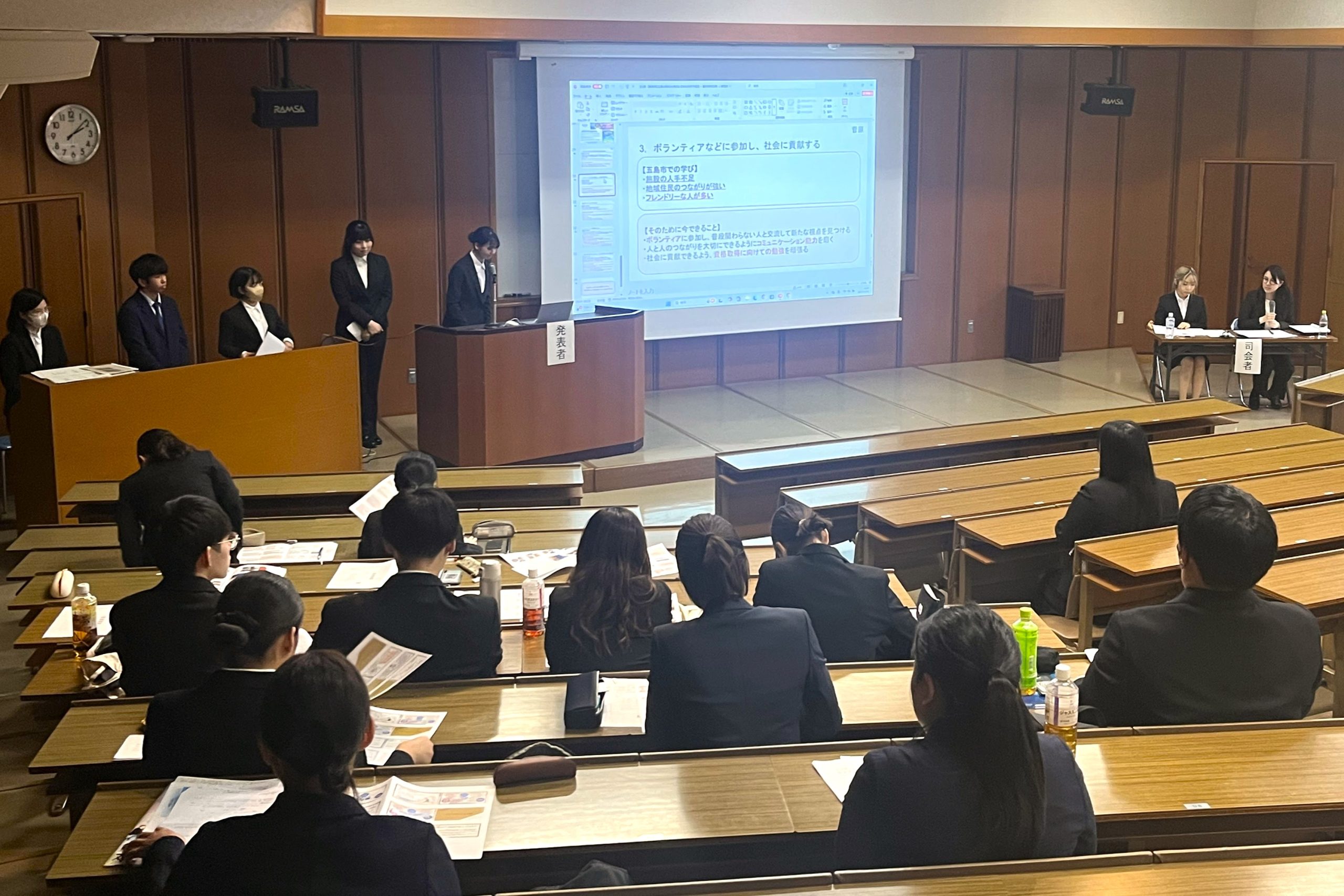 続いて、地域包括支援実習に参加した学生が3グループに分かれ、実習での学びや今後の課題等を発表しました。高校生や初めて聞く人にも分かりやすくするために図を作成したり、動画を挿入したりと、各グループで工夫がなされていました。