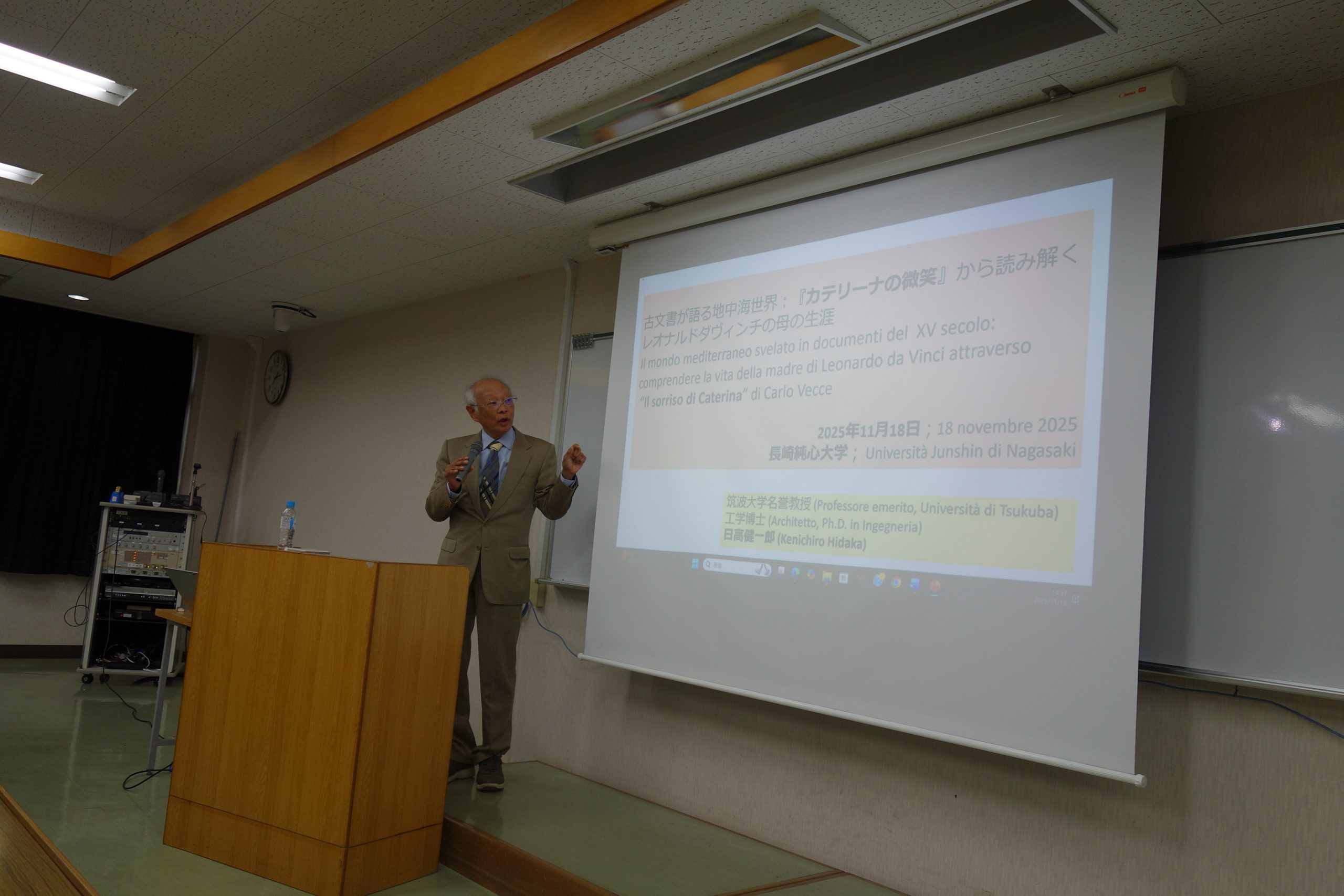 2024年にみすず書房から刊行された『カテリーナの微笑―レオナルド・ダ・ヴィンチの母―』の翻訳者である 日高健一郎先生(筑波大学名誉教授・工学博士)を講師としてお招きし、作品の舞台となる15世紀地中海世界の歴史的背景について、豊富な写真や史資料を用いてご講演いただきました。