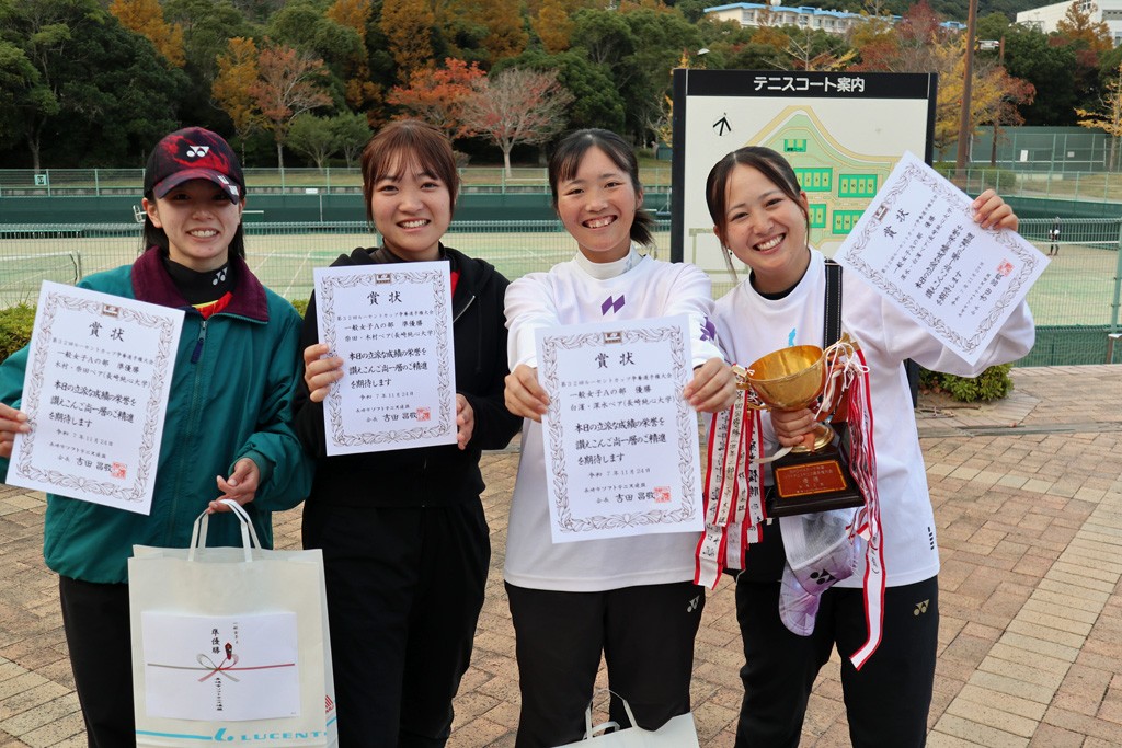 2025年11月24日(月・祝)に長崎市総合運動公園かきどまり庭球場で「第32回ルーセントカップ争奪選手権大会」が開催されました。この大会は、長崎市ソフトテニス連盟が主催する個人戦の大会で、男女それぞれA・B・Cとクラスが分かれており、一般の選手だけでなく小中高生も出場する大会です。本学からは、男子2ペア、女子4ペアが出場しました。