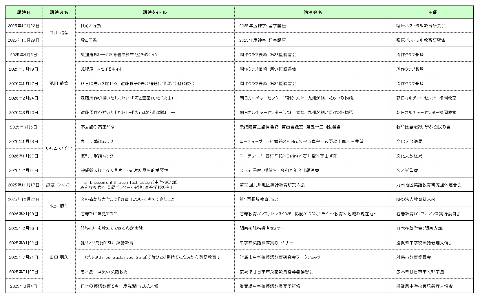 Homeお知らせ 2026.04.03言語文化情報学科 言語文化情報学科:依頼を受けた講演・研修の実績(2025年度) 2025年度に「言語文化情報学科」の教員に依頼がありました講演・研修等の実績は、以下の通りです。 「言語文化情報学科」は、2024年度より「文化コミュニケーション学科」から名称を変更しました。 本学科には、「言語」「文化」「情報」の分野や、司書、学芸員等の資格指導を専門とする専任教員が在籍しています。 講演・研修等をご依頼されたい場合には、ご相談ください。 シェアツイート送る 次の記事へ 一覧へ戻る 前の記事へ