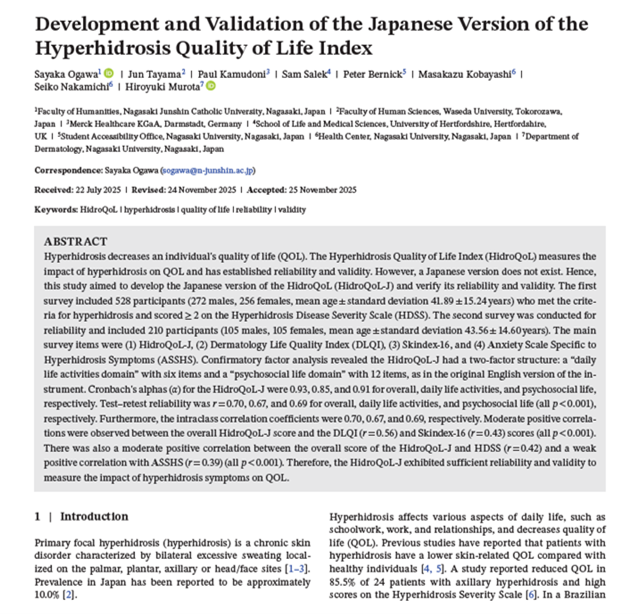 福祉・心理学科の小川さやか准教授らの研究グループは、多汗症(過剰な発汗)による生活の質(QOL)への影響を評価する尺度「HidroQoL」の日本語版(HidroQoL-J)を作成し、その妥当性と信頼性を検証しました。