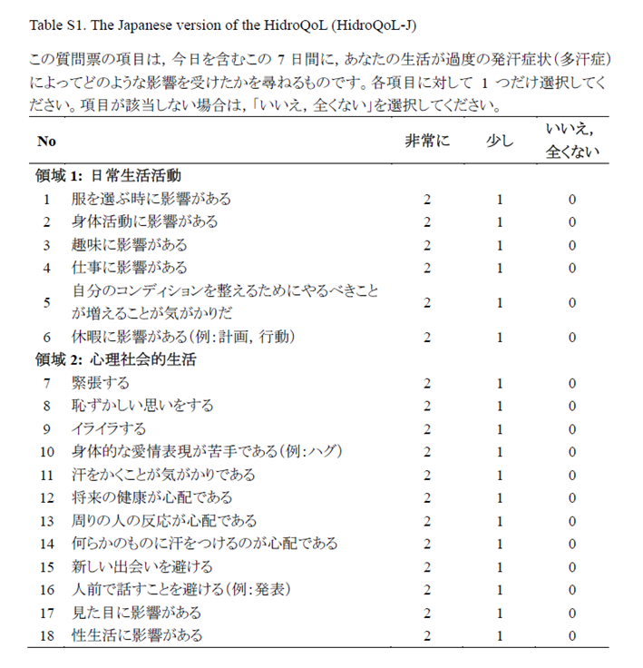 これまで日本国内には信頼性が検証された多汗症に特化したQOL尺度は存在しませんでしたが、本研究により、日本人の多汗症患者のQOLを適切に評価することが可能となりました。本尺度は、今後の多汗症治療や心理的支援の質向上への寄与が期待されます。