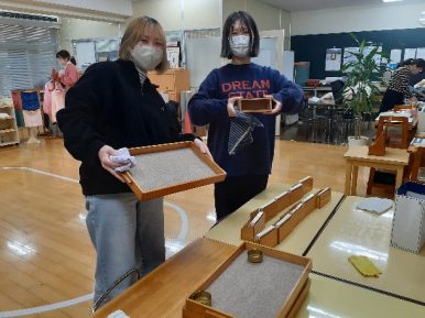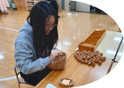 - 1年生の頃はどこにどの教具があるかも分からなかったのに、4年間を通してどこにどんな教具が置いてあるのか、そしてどんなねらいで教具が用意されているのか分かることに、掃除をしながら成長を感じました。また、この4年間モンテッソーリ教育を学んできたときの日々を思い出していました。決して、4年間学び続けることは簡単ではなかったけど、この環境と仲間たちに感謝しています。