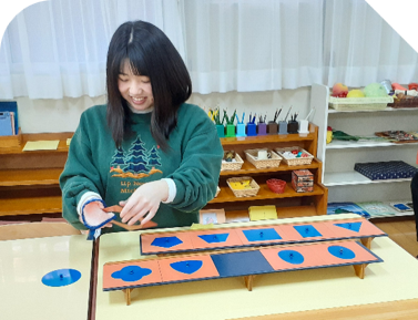 - 教具を一つ一つ掃除しながら、子どもたちに提供をした記憶や仲間と練習した日々を思い出しました。また、先生方と話しながら4年間を振り返り、改めてモンテッソーリ教育の素晴らしさを感じました。心を込めて掃除できたのでよかったです。