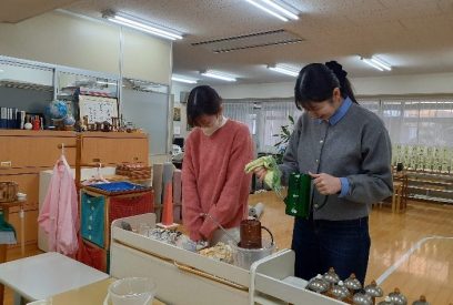 モンテッソーリ教員免許取得を目指し、4年間多くの時間を過ごしたモンテッソーリ演習室ともお別れが近づいてきたこの日、何時間も練習したモンテッソーリ教具をみんなできれいにしました。