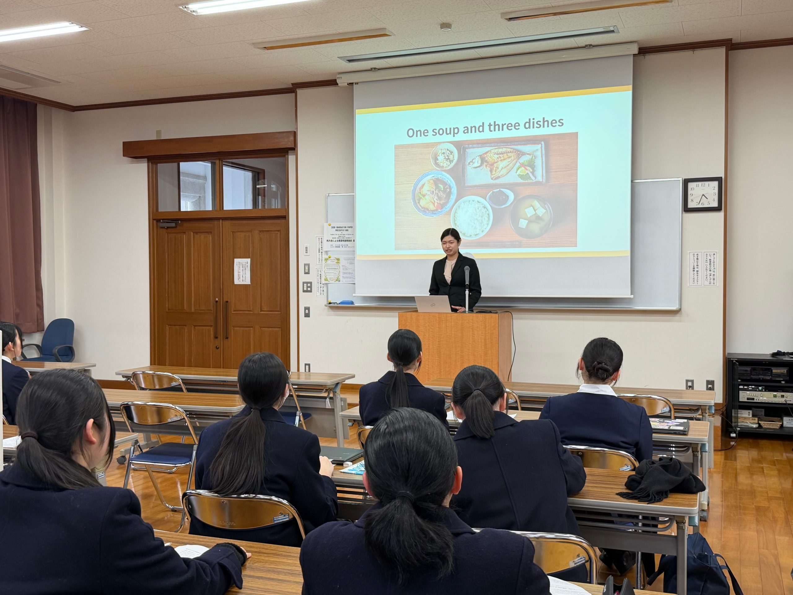 Fourth year English Communication majors gave their graduation presentations to high school students at Junshin Girls’ High School on January 30th. Three graduating students who had written their graduation theses and presentations in English graciously shared their time with high school students to talk about their experience writing an academic paper and giving a presentation, both completely in English. The event began with third year English Communication majors acting as emcees and introducing each presenter one by one. Presentations on the following three topics were given: