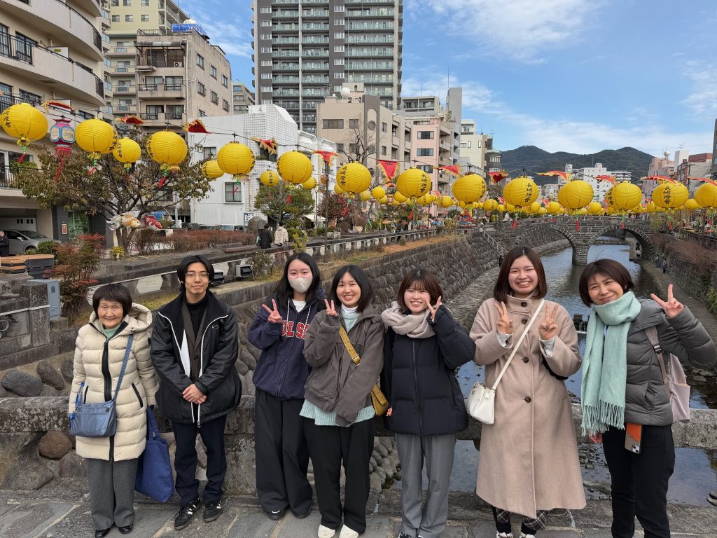 実際のツアーに先立ち、学生たちは各スポットについてリサーチを行い、ツアーガイドで頻繁に使われる語彙や文法構造を習得するなどの準備を重ねてきました。ツアーの案内はすべて英語で行われ、訪問先は眼鏡橋、興福寺、中通り商店街、そして出島でした。