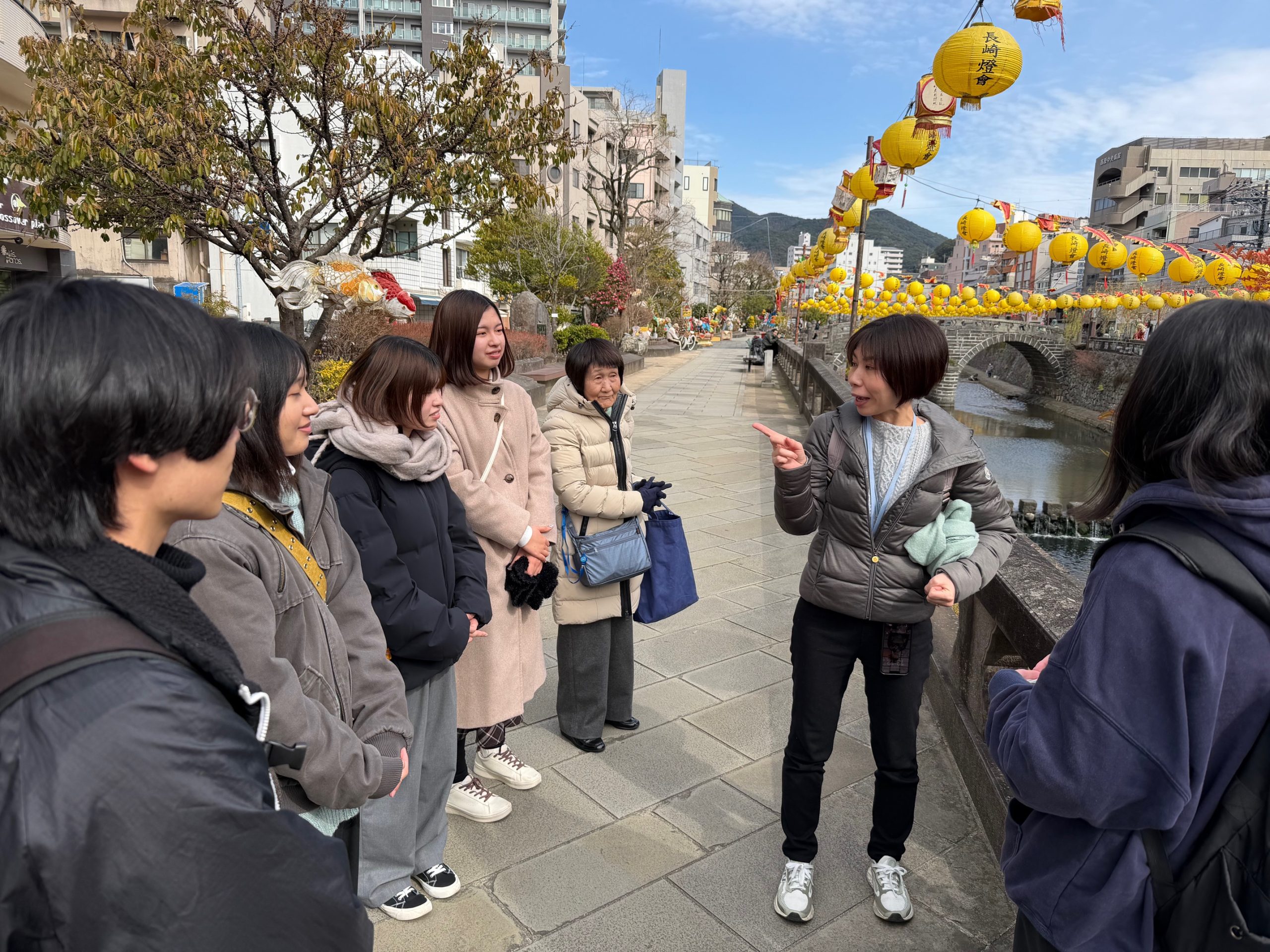 実際のツアーに先立ち、学生たちは各スポットについてリサーチを行い、ツアーガイドで頻繁に使われる語彙や文法構造を習得するなどの準備を重ねてきました。ツアーの案内はすべて英語で行われ、訪問先は眼鏡橋、興福寺、中通り商店街、そして出島でした。