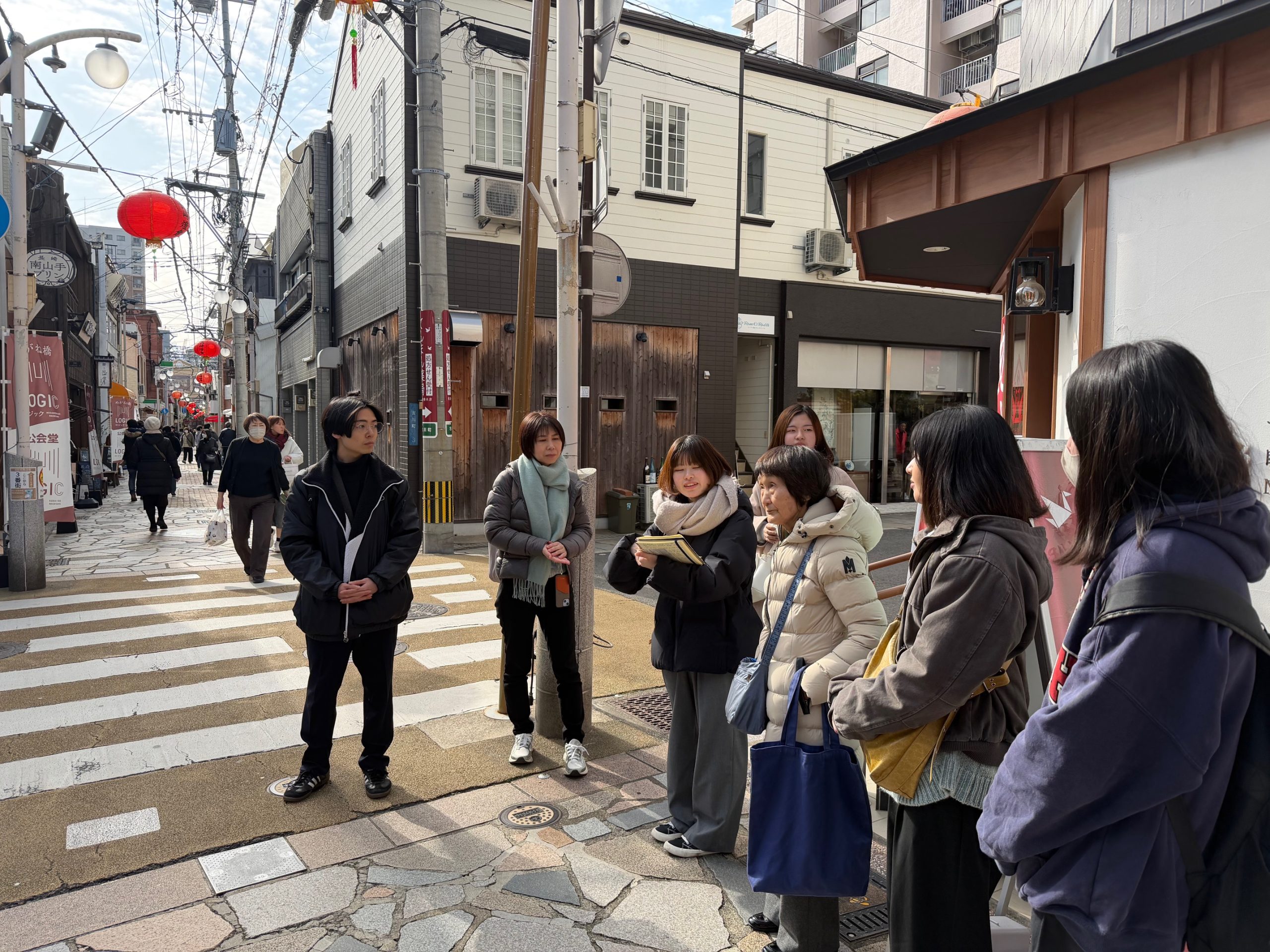 1月31日、「通訳実務演習」を履修する学生たちが、浜町地区の名所を巡るツアーを実施し、本コースを締めくくりました。学生たちは交代で、市中心部にある重要な史跡の歴史を解説したほか、さまざまな小話や逸話を紹介しました。