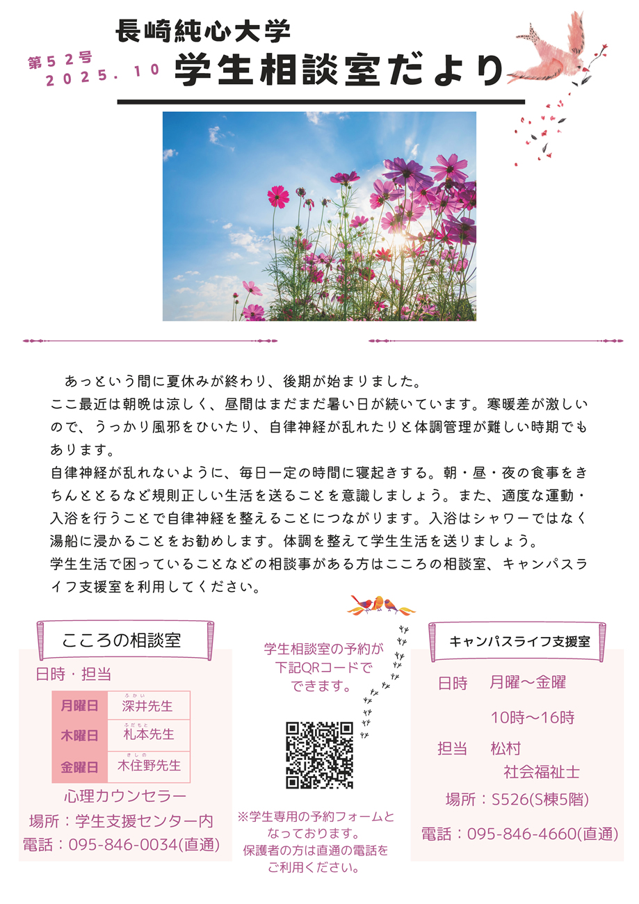 Homeお知らせ 2025.10.15大学からのお知らせ 学生相談室だより(第52号)2025.10~ こころの相談室・キャンパスライフ支援室 より ~ 学生相談室だよりが発行されました。 学内にも掲示しています。 学生相談室 シェアツイート送る 一覧へ戻る 前の記事へ