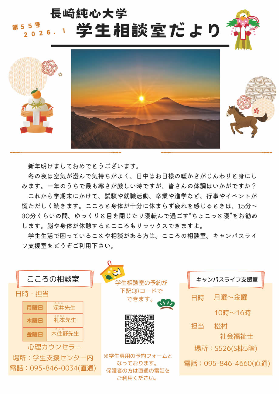 Homeお知らせ 2026.01.06大学からのお知らせ 学生相談室だより(第55号)2026.1~ こころの相談室・キャンパスライフ支援室 より ~ 学生相談室だよりが発行されました。 学内にも掲示しています。 学生相談室 シェアツイート送る 次の記事へ 一覧へ戻る 前の記事へ